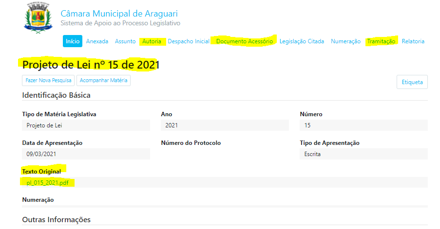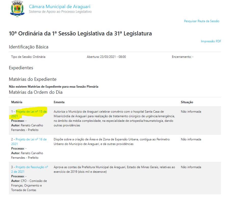 Quando estiver na pauta da próxima sessão, clique no link da matéria que deseja e será levado à pagina principal desta. Lá o cidadão poderá ter acesso ao texto integral, tramitação, documentos acessórios, legislação citada, normas relacionadas e todas as informações necessárias.