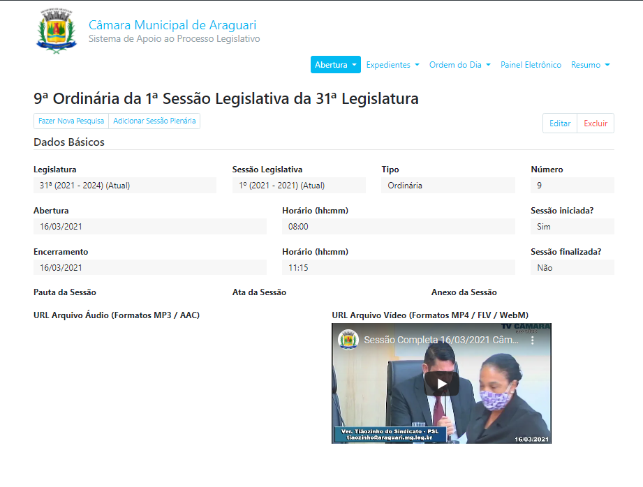 Boa tarde. Estamos disponibilizando a partir deste ano os vídeos gravados sim. Para pesquisar a Sessão, clique em SAPL que é primeiro link do grupo PROCESSO LEGISLATIVO, à esquerda do site e em seguida, SESSÃO PLENÁRIA, ou ainda o link "sessões plenárias", no mesmo grupo.